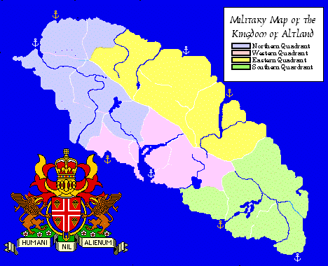 The Royal Altlandic Navy, presently under the general command of the Grand Admiral, His Lordship Hijnrik, Earl of Sigesburgh, consists of 576 vessels of various sizes and descriptions, as well as military harbors and costal naval bases, manned by approximately 40,000 officers and seamen. It is divided into four Fleets, one of which is berthed in a permanent naval base in each Quadrant: in the north at Niumarktshavn (Est.), in the west at Flotenburgh near Grethavn (Hav.), in the south at Marvilla (Luc.), and in the east at Port'Anselmo (Ans.). The Admiralty, seat of the Grand Admiral and the central administration of the naval forces, is at the capital of Midlburgh (Jer.). Each Fleet is divided into four Flotillas of 144 vessels; each Flotilla, into 6 Squadrons of twenty-four vessels; each Squardon, into four Battle Groups of six vessels. Although this is the organizational structure, actual operational groupings differ widely according to circumstances.