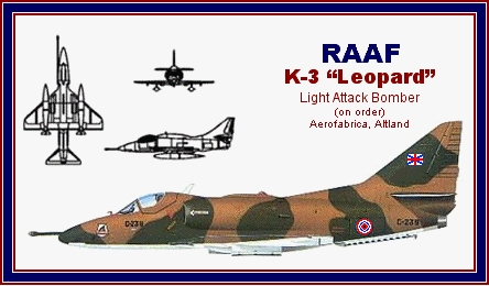 Until the year 300, the Kingdom of Altland is not maintain an air force. Although under the Neonesian usurpation a modest start was made toward developing one, these beginnings were cancelled at the time of the restoration, and it was not until Altland had been given trusteeship mandates by the UNVSC that the government acknoledge the need for such a branch of the Forces. Accordingly, the nation's leading civil aviators were invited to form a planning commission early the year 301, and within a year the Royal Altlandic Air Force was fully planned and began active recruitment and training of personnel, with technical advice from officers on loan from Westria and Whitlam. Since then, the transport and fighter commnds have developed rapidly and are presently (305) quite robust. Although two new light fighter-bombers are now on order (see pictures below), the bomber command is less developed, mainly due to His Altlandic Majesty's moral scruples about the uses to which bombers are normally put (for similar reasons, there is no missile command). Presently, the following command structure is in place, and is still in the process of being translated into a three-dimensional reality.