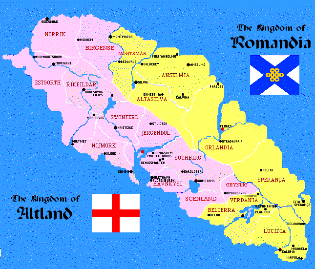 The present king, last representative in the direct male line of the ancient House of Vittorino-Montemar, is the descendant of Jerg, called "Augst" (George Augustus), the first ruler of the Christian Teutens more than a thousand years ago. About a third of the nobility, including all those currently governing provinces, are also descended from this legendary (but nonetheless unquestionably also historical) figure. The establishment of a unified monarchy and the succession of rulers will eventually be recounted at greater length once the "History" compiled by Tocitys Spelmon and Anna dela Belterra under commission from the Royal Society for Historical Lore is translated from the original Altlandic languages and made available to the international public. Given below, however, is the table of Altlandic ruling families.